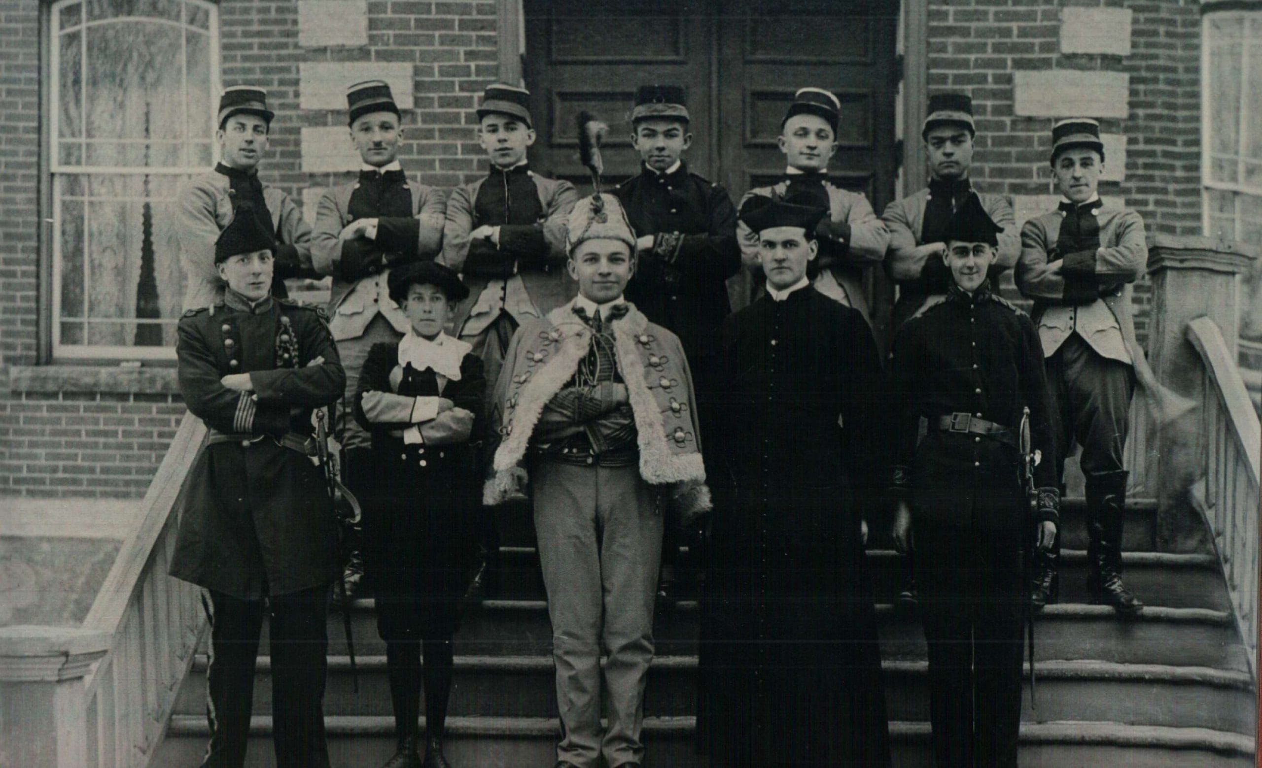 Description : Au Collège Sacré-Coeur en 1905. On reconnaît Eugène Lemerise, Valmore Dumont, Arthur Robillard, Auguste Lavoie, Alfred Lavoie, René Marcie, Vitalice Davignon, ? Dupuis, Arthur Gosselin, ? Véronneau, Arthur Lahaie
