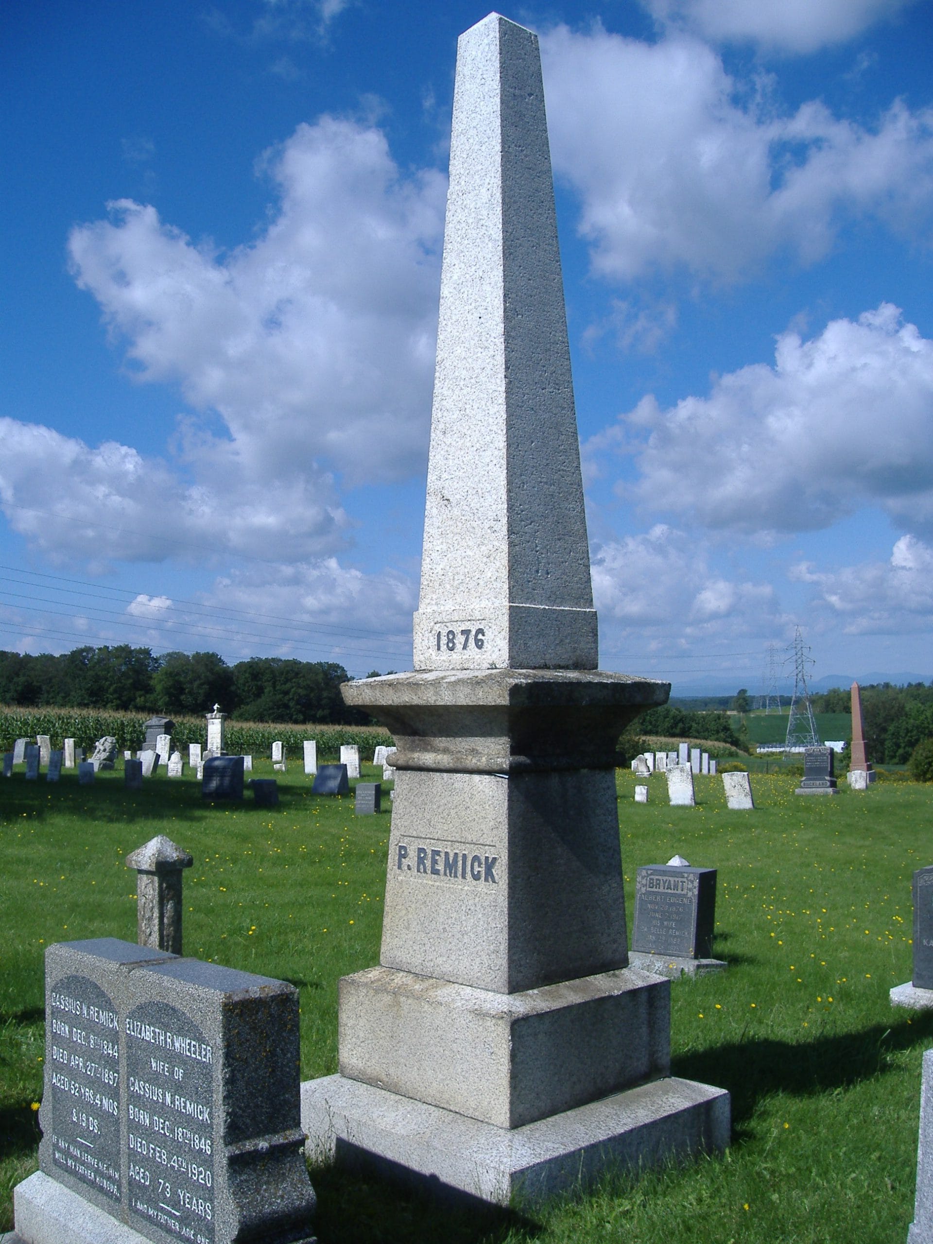Description : Le grand obélisque de P. Remick, décédé en 1876. Devant le pilier, on peut voir la stèle du marchand général Cassius N. Remick et de sa femme Elisabeth Wheeler. La partie inférieure du monument, présente deux paroles tirées de l’Évangile : « If any man serve me him will my father honour » et « I and my father are one » («Celui qui me sert sera honoré de mon Père» et «Moi et mon Père, nous sommes un»). Cassius Remick a débuté sa carrière à Barnston Corner comme commis pour devenir, à la fin d