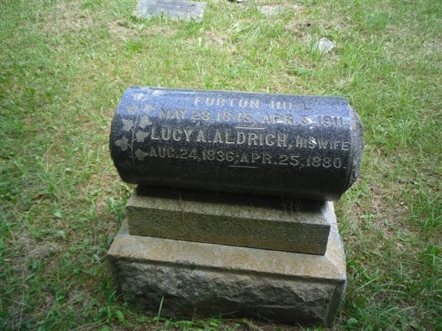 Description : Un traversin en granit noir domine le monument du couple Furton Hill et Lucy Aldrich, cette dernière étant apparentée à la famille Horn. Les dates indiquées montrent que l’homme a épousé une femme âgée de neuf ans de plus que lui.